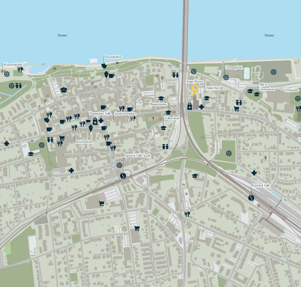 5 minutes to the center of Tulln, shopping and leisure right at your doorstep – Vienna in just 25 minutes by car or 40 minutes by train.